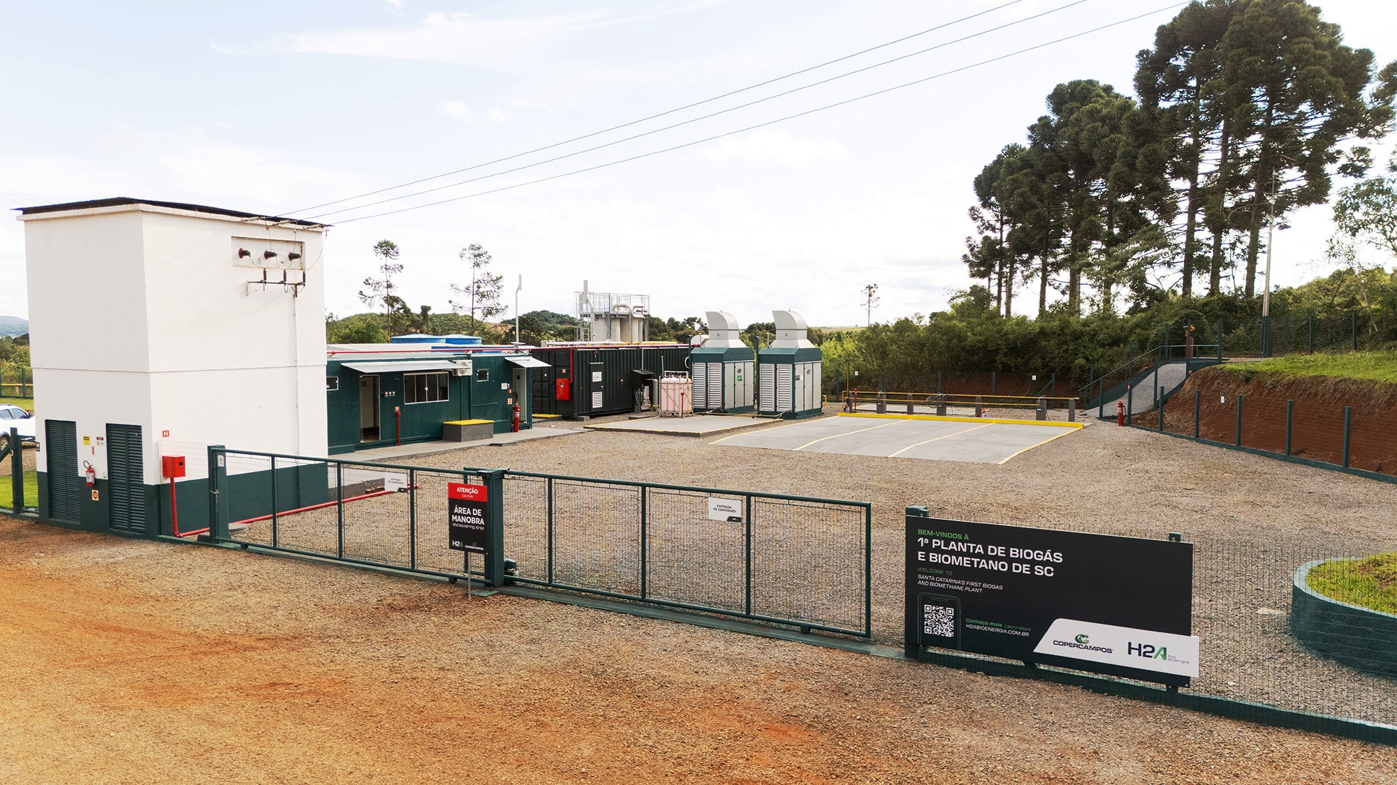 Localizada a aproximadamente 15 KMs da cidade de Campos novos, às margens da BR 282, a planta industrial da usina está quase 100 por centro pronta e a distribuição de biometano se inicia entre final de janeiro e fevereiro de 2026.